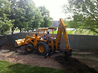 We did a little renovation to our yard this year because we had a fence that was falling down on the side of our property. We put up a concrete wall in place of the fence and then poured concrete in the backyard so that we can build a shed on it. Taylor did almost all the prep work himself so we had a backhoe in our yard while he was working on it. Logan is obsessed with tractors, as most little boys are. He can point out every tractor and tell you exactly what kind it is. If you call it a backhoe and it's actually a digger he'll be the first to correct you. Logan love love loved working out in the yard with his dad and riding on the backhoe with him. It was a sad day when Taylor had to take the backhoe back to work.